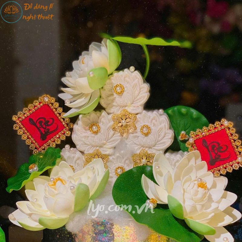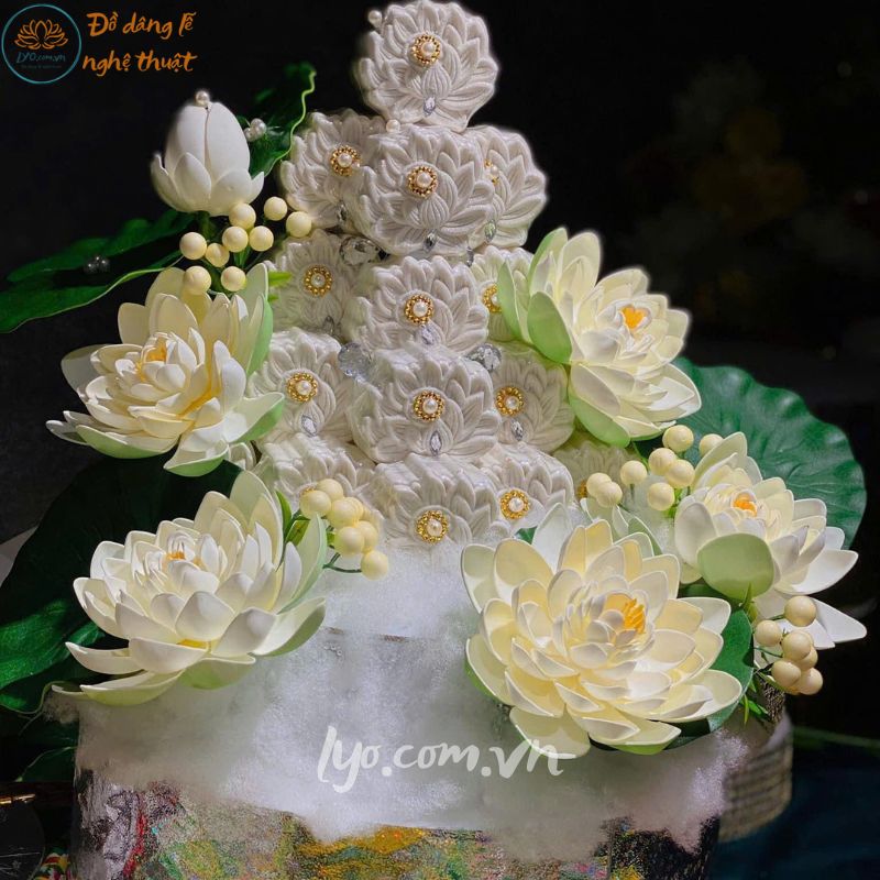 Sản phẩm được tạo hình từ những bông sen trắng tinh khôi, tượng trưng cho sự thanh khiết, thuần túy. Kết hợp cùng oản đường trắng ngà được xếp tầng tinh tế, tạo nên tổng thể hài hòa, trang nhã, phù hợp với không gian thờ cúng trang nghiêm.