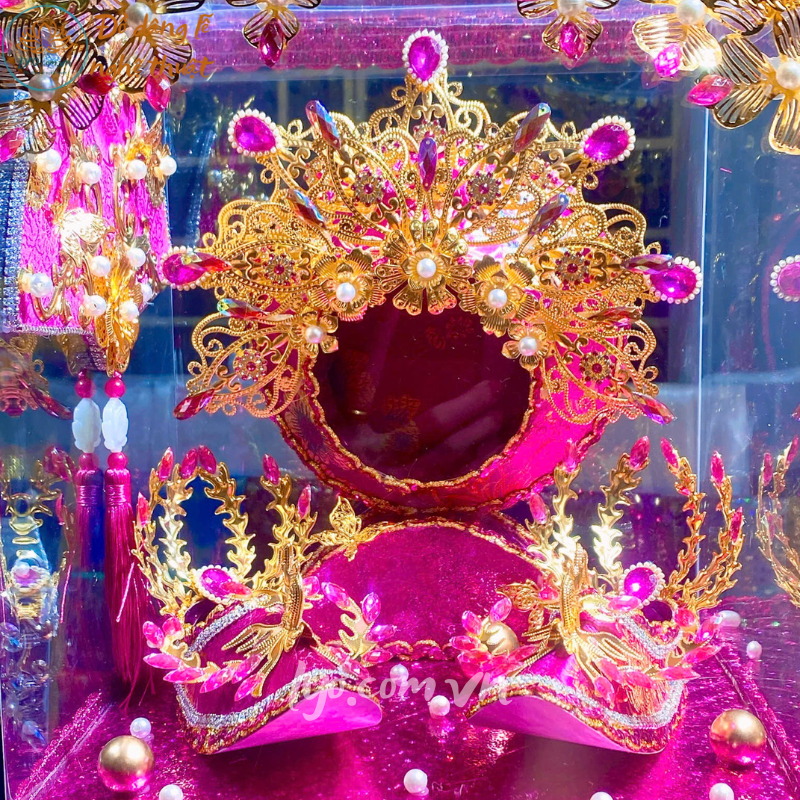 - Chất liệu: Sản phẩm được làm từ Vải gấm cao cấp, kết hợp các chi tiết trang trí thủ công như hạt cườm, kim sa, lông vũ, hoa giả, tạo nên vẻ đẹp lộng lẫy, tinh tế. Bộ mã được bảo quản trang trọng trong hộp mica.